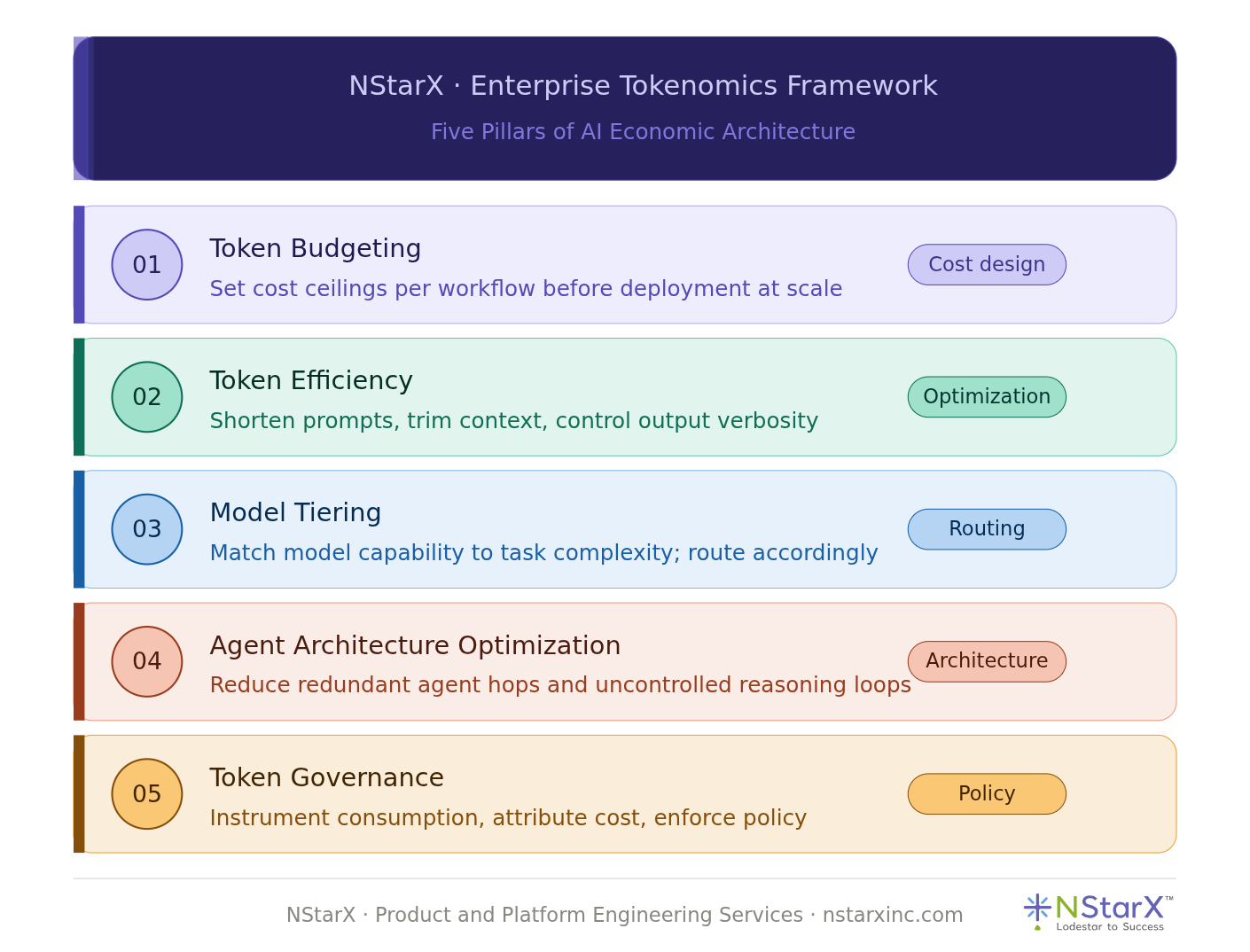 At NStarX, we work with engineering teams building AI-first products and platforms. One of the most consistent gaps we see — even among technically sophisticated organizations — is the absence of a deliberate economic design layer in their agent architecture. The framework we have developed to address this is built around five pillars.